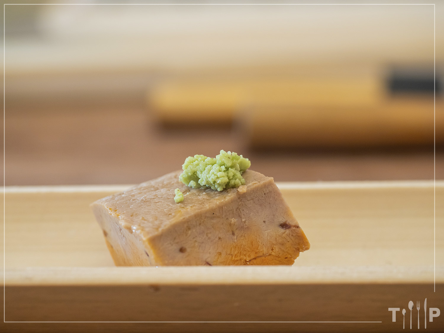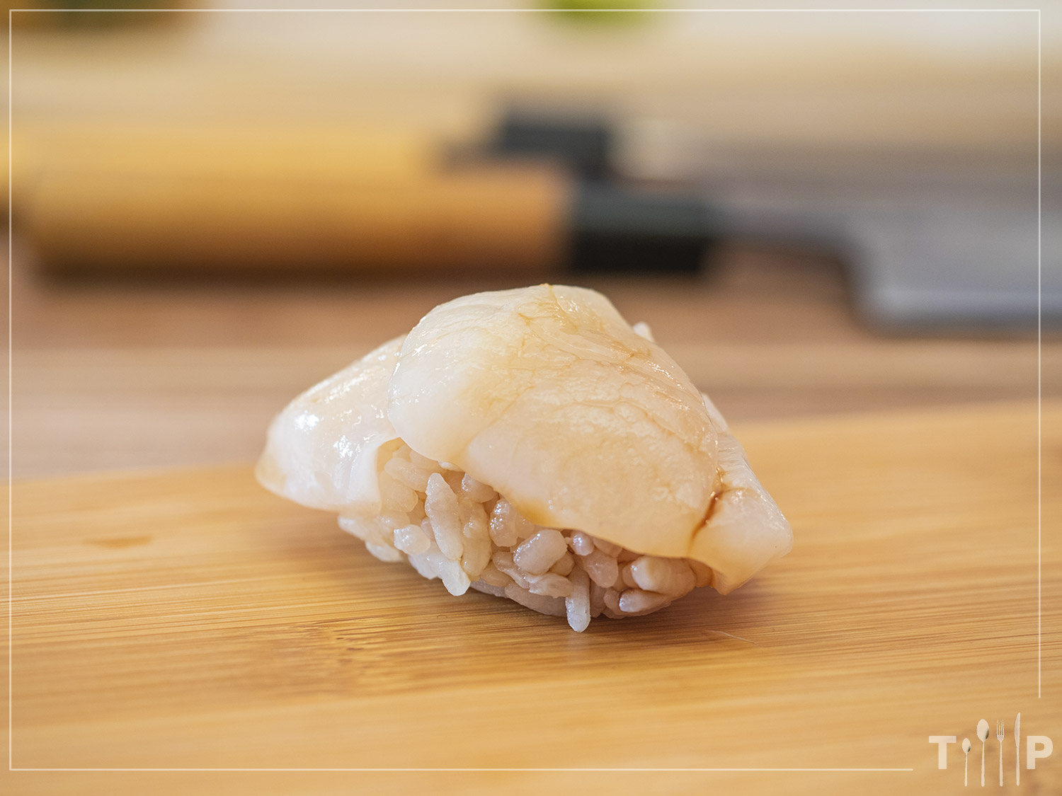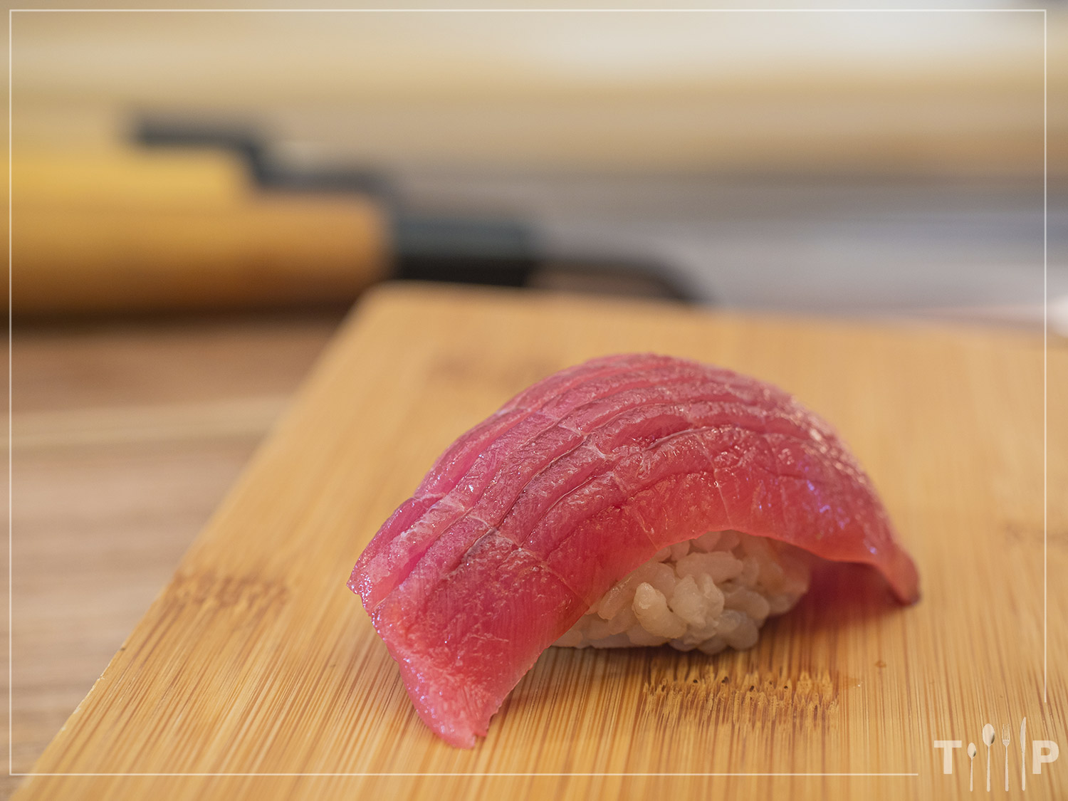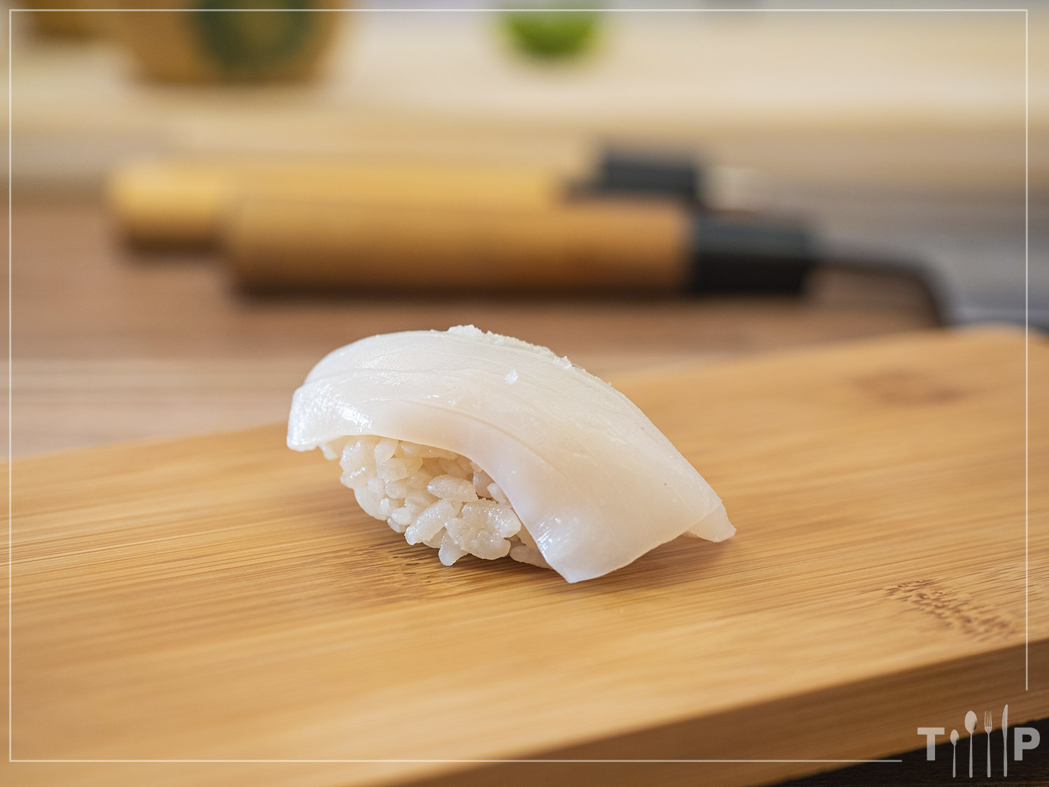 El pase del futomaki fue otro de nuestros bocados favoritos en ambas visitas, no solo porque es una elaboración que nos encanta sino porque da tiempo a hacer un alto entre bocado y bocado y mantener una conversación más larga con los otros comensales y el itamae. Un maki que bien nos habríamos comido entero en vez de solo una ‘rodaja’.