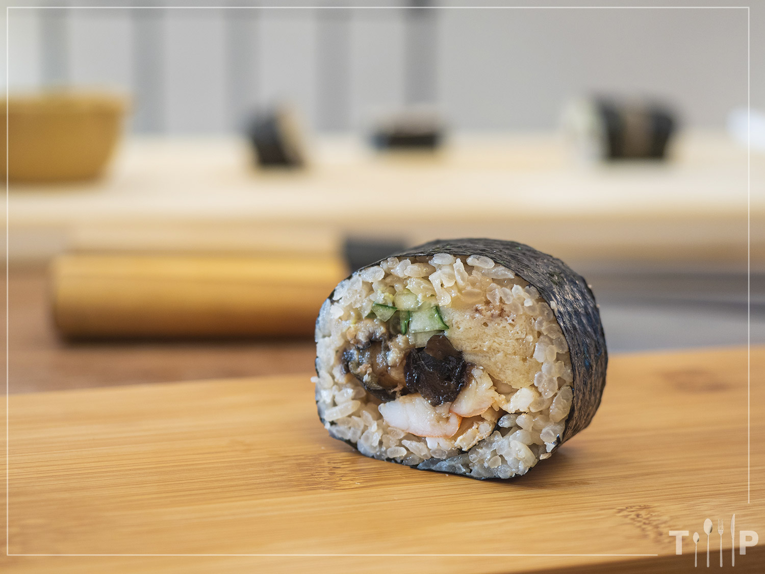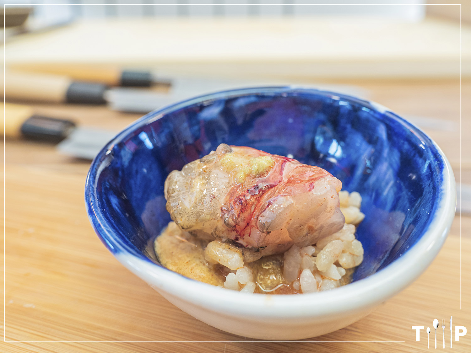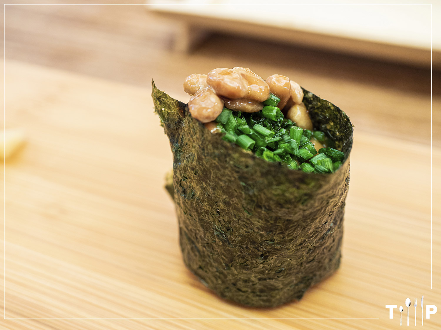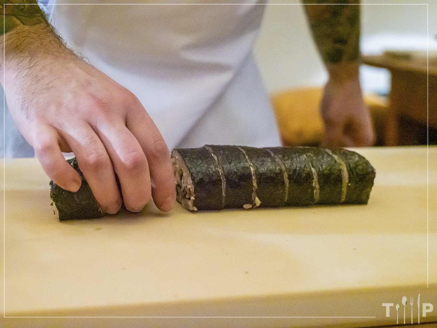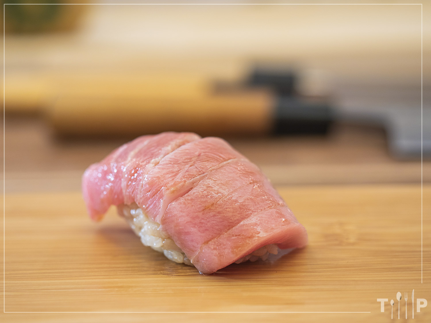 El pase del futomaki fue otro de nuestros bocados favoritos en ambas visitas, no solo porque es una elaboración que nos encanta sino porque da tiempo a hacer un alto entre bocado y bocado y mantener una conversación más larga con los otros comensales y el itamae. Un maki que bien nos habríamos comido entero en vez de solo una ‘rodaja’.
