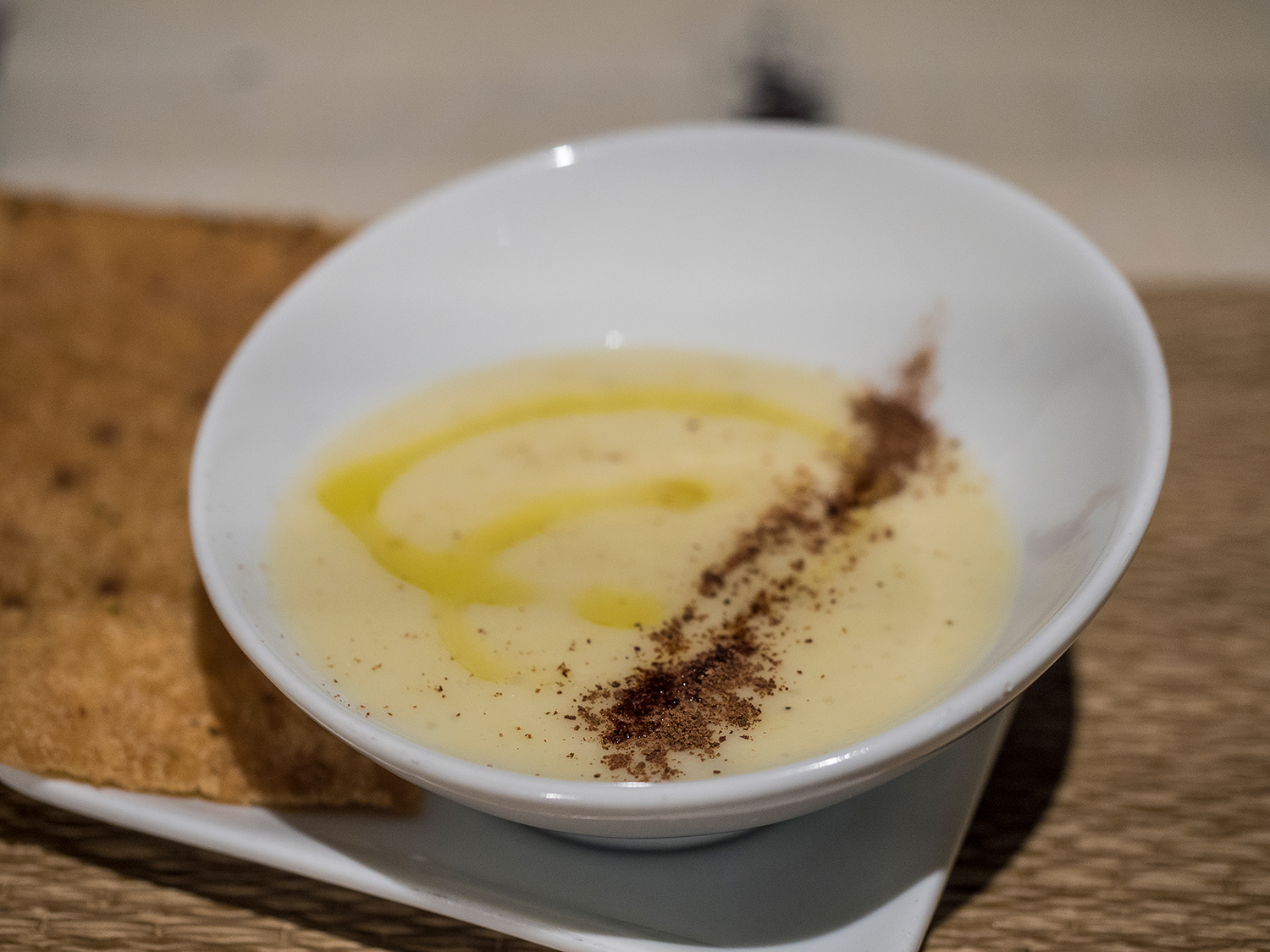 Las yemas de huevo fritas sobre vieiras asadas con crema de patata sonaba demasiado bien como para no pedirlo, y no defraudó en absoluto. Muy buen detalle también el de ponerte un aperitivo mientras esperas la comida, en nuestro caso fue una rica crema de puerros.