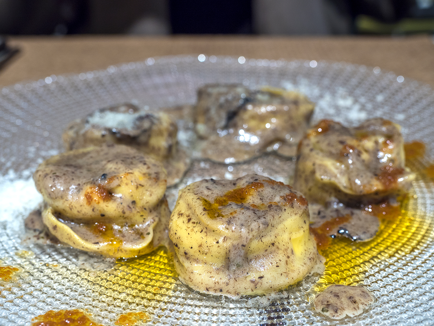 La cosa es que desde hacía mucho tiempo yo tenía antojo de tomarme una buena carbonara, ése era el verdadero motivo por el que acabamos yendo a un restaurante italiano. Ya solo teníamos que elegir un plato más, y habiendo elegido uno de pasta dura, por qué no probar uno de pasta fresca rellena. Vuelvo a lo que decía antes de no tener problemas a la hora de elegir, solo había 2 platos de pasta rellena y los dos dijimos casi a la vez «¡éste!».