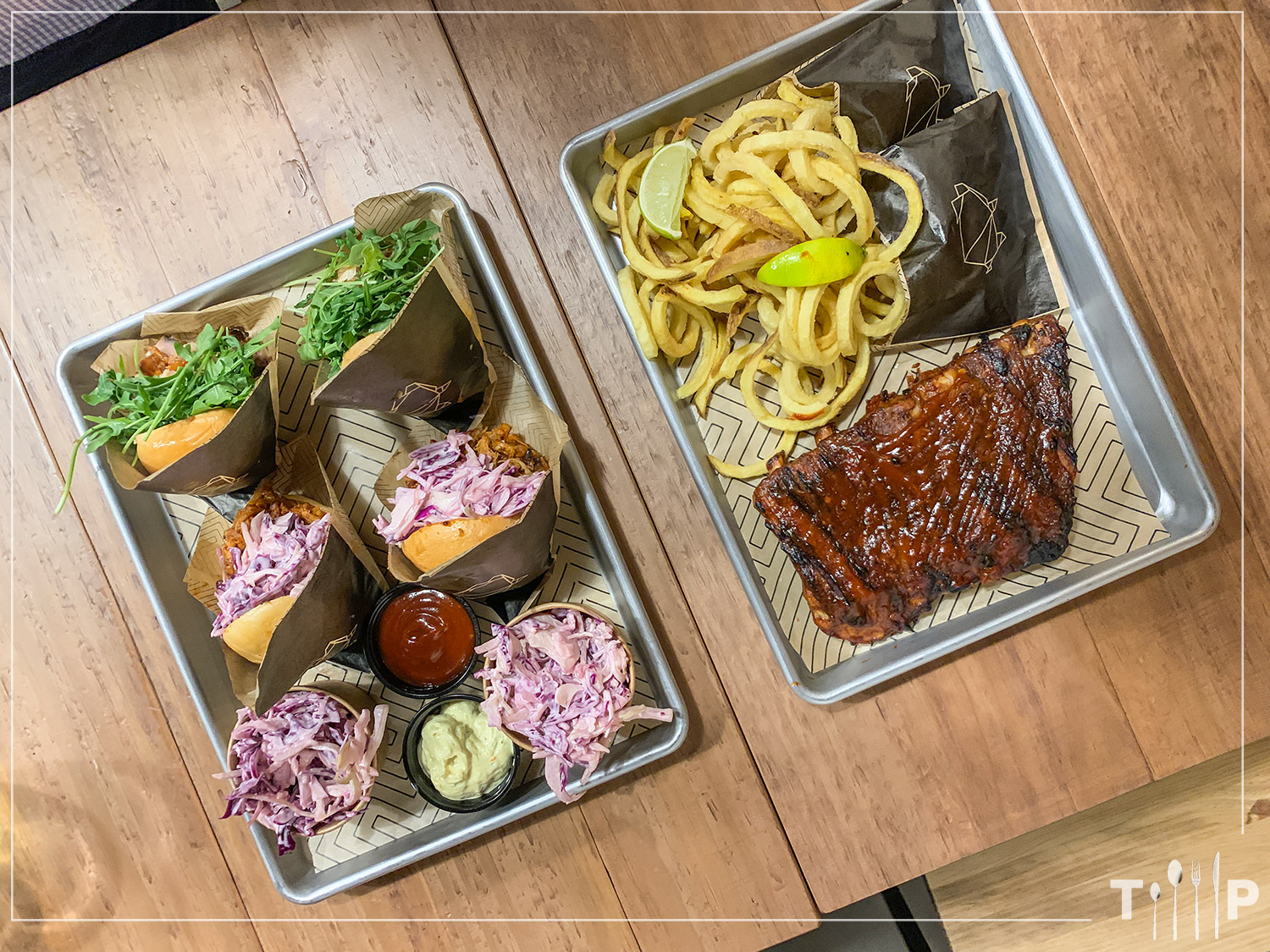 Lo siguiente que teníamos que decidir era el formato, ¿dos bocadillos grandes o cuatro pequeños más fáciles de compartir? Ellos mismos dan la solución con dos bandejas que ofrecen, una con un par de sándwiches pequeños y otra con cuatro sándwiches pequeños y medio costillar. Al final no fue tan difícil.