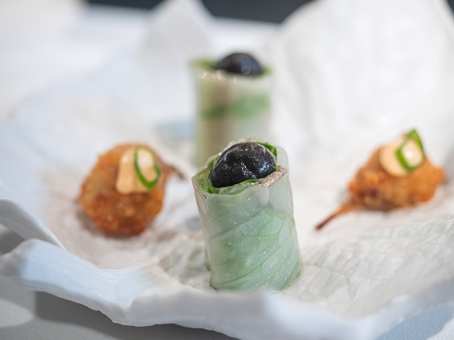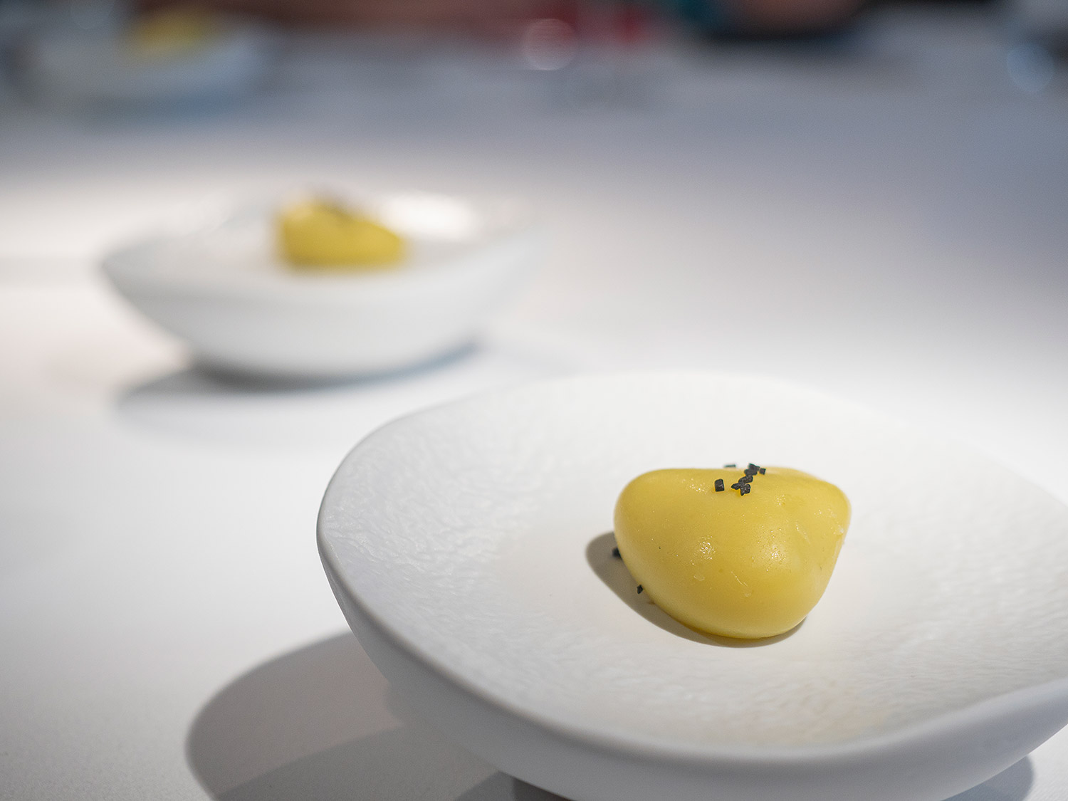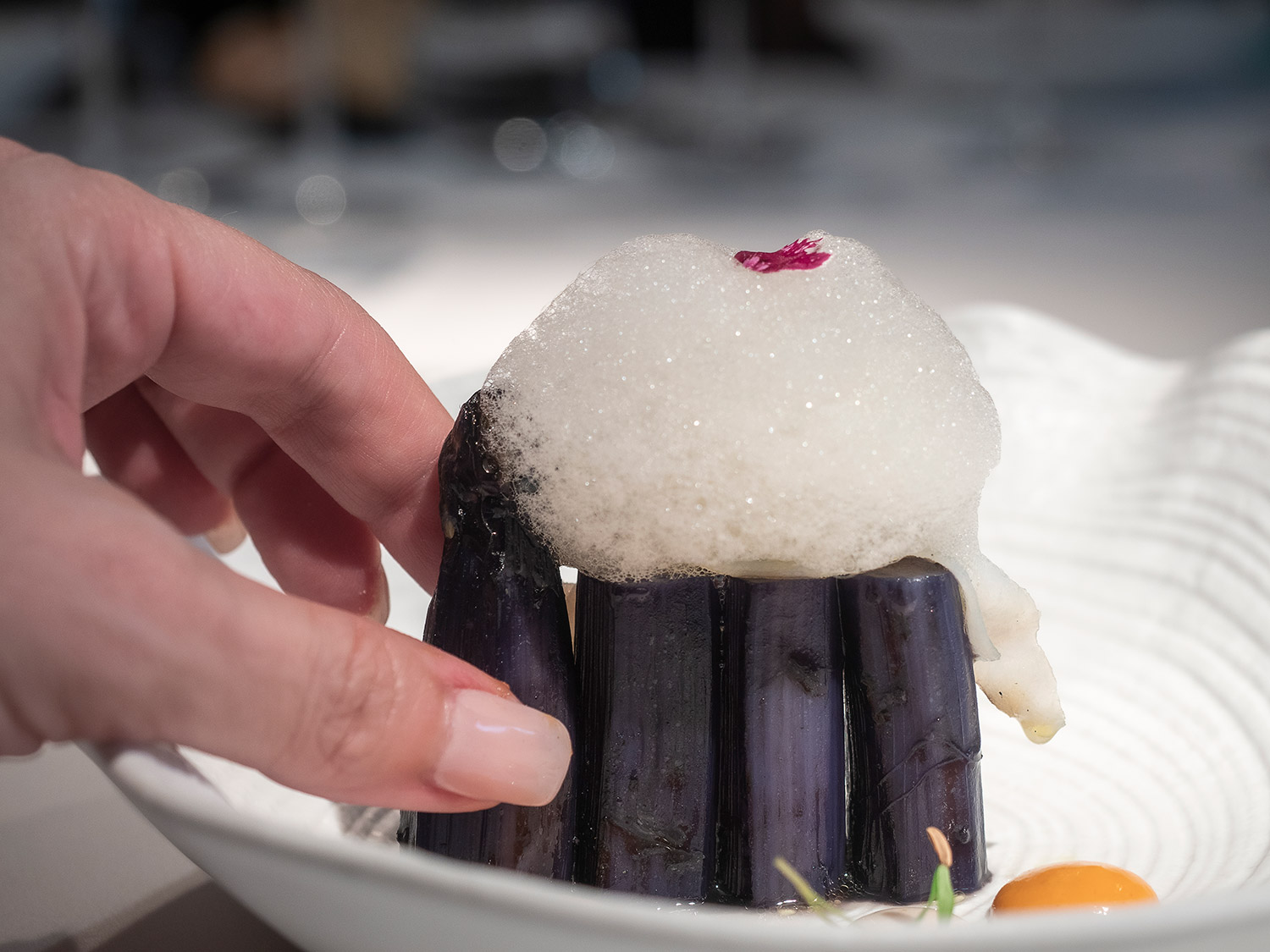 La comida arranca con una sucesión de pequeños bocados antes de entrar en cosas más serias: trucha Niçoise, anca de rana, espárrago verde y aceite de oliva a modo de mantequilla para poder untar con facilidad.