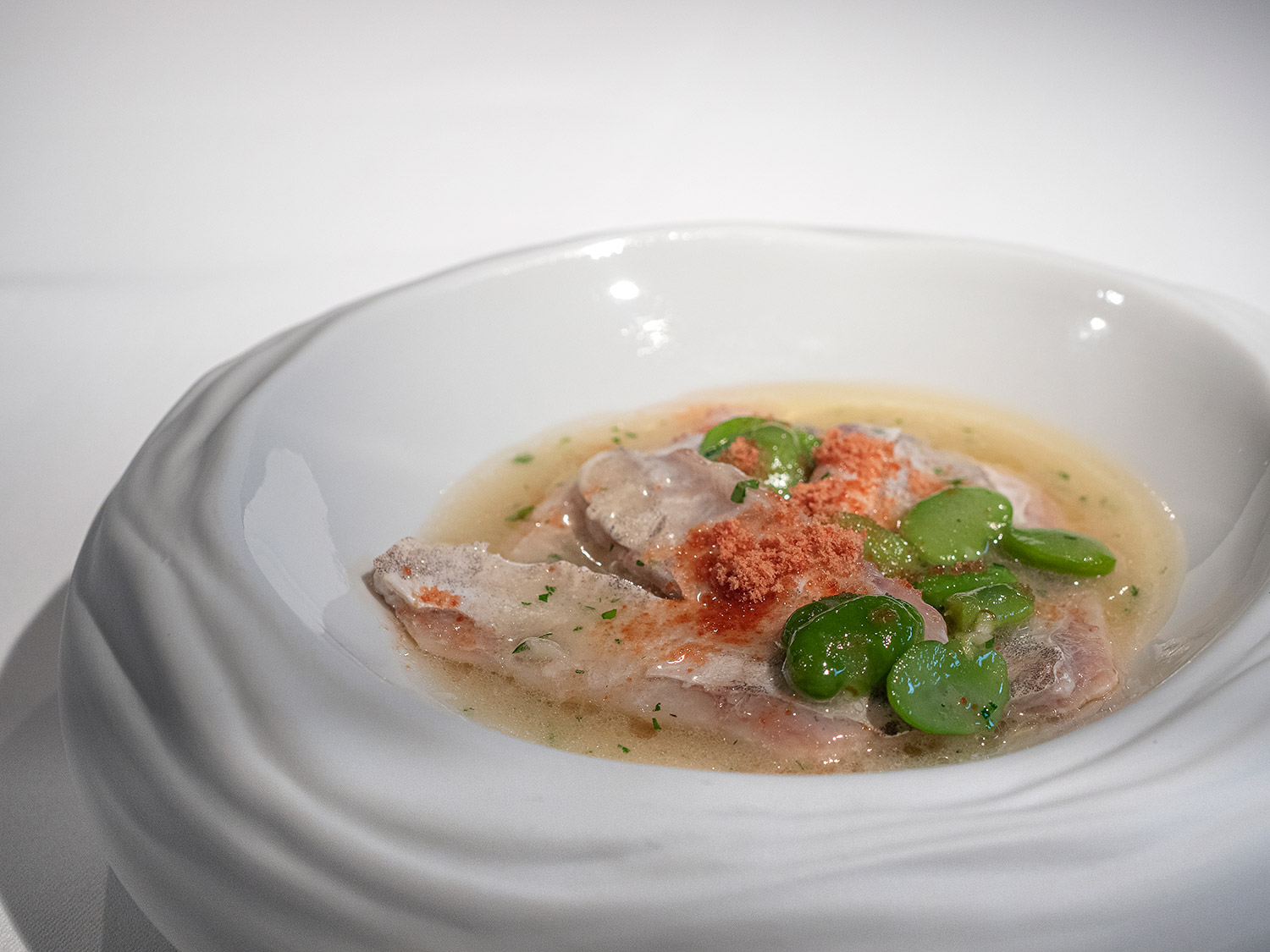 Los primeros platos que llegaron fueron toda una suerte porque a algunas de las verduras que disfrutamos les quedaban días para terminar la temporada. Tanto los espárragos como los guisantes lágrima y las alcachofas baby eran de Espárragos Belloso, empresa con la que tuvimos la suerte de pasar un buen rato por la mañana viendo algunos de sus cultivos y las instalaciones donde preparan las verduras para la distribución y venta con el chef del restaurante Trigo, Víctor Martín.