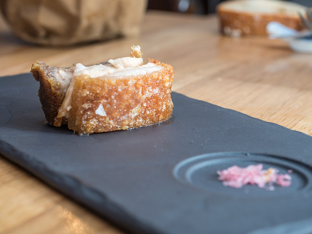 Pero sigamos en la barra un rato más. Tapas con cada bebida —una muy buena tortilla de bacalao que no se puede pedir, solo la sirven como tapa—, cervezas muy bien tiradas y un montón de raciones que, al igual que la carta del restaurante, invitan a quedarse un rato ahí. Bravas. ¡Y torreznos! Mi perdición.