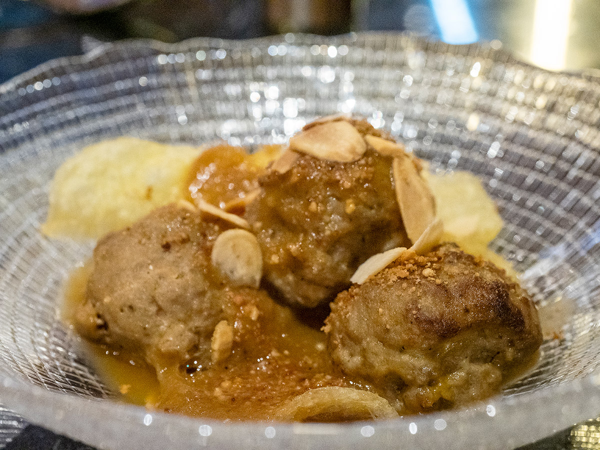 Con los principales no lo tuvimos más fácil, por suerte solo tienen 4 y elegimos 2, fuimos a por los tacos de lagarto guisado y las albóndigas de abanico guisadas en una salsa de azafrán. Los tacos estaban riquísimos, como todo lo que habíamos comido hasta el momento; con las albóndigas nos arrepentimos de pedir media ración, pero había que dejar sitio para el postre, la torrija, el único que ofrecen. Cada vez nos lo dejaban más fácil para elegir ;)